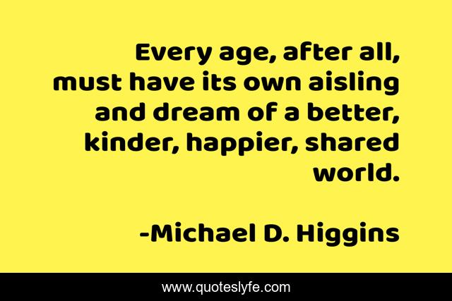 This page presents the quote "Every age, after all, must have its own aisling and dream of a better, kinder, happier, shared world.". Author of this quote is Michael D. Higgins. This quote is about better, world, dream,.