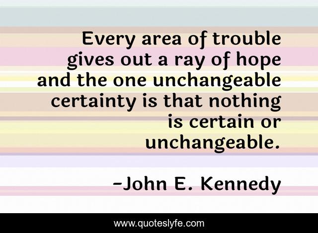 This page presents the quote "Every area of trouble gives out a ray of hope and the one unchangeable certainty is that nothing is certain or unchangeable.". Author of this quote is John E. Kennedy. This quote is about uncertainties, doubts,.