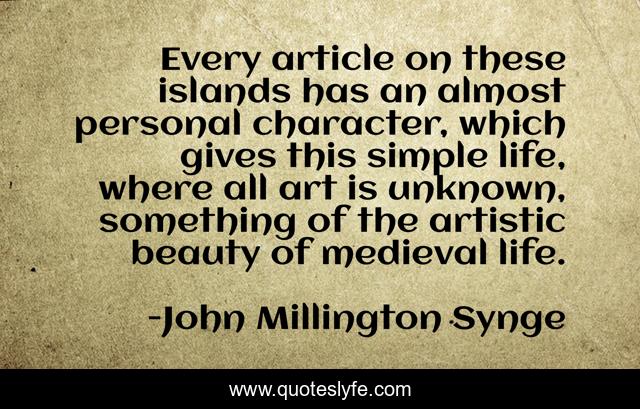This page presents the quote "Every article on these islands has an almost personal character, which gives this simple life, where all art is unknown, something of the artistic beauty of medieval life.". Author of this quote is John Millington Synge. This quote is about art, life, character,.