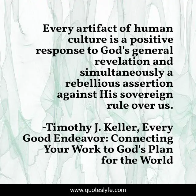 This page presents the quote "Every artifact of human culture is a positive response to God's general revelation and simultaneously a rebellious assertion against His sovereign rule over us.". Author of this quote is Timothy J. Keller, Every Good Endeavor: Connecting Your Work to God's Plan for the World. This quote is about common-grace, culture, depravity,.