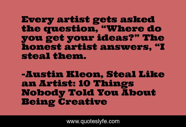 This page presents the quote "Every artist gets asked the question, “Where do you get your ideas?” The honest artist answers, “I steal them.". Author of this quote is Austin Kleon, Steal Like an Artist: 10 Things Nobody Told You About Being Creative. This quote is about enthusiasm, inspirational, artists,.