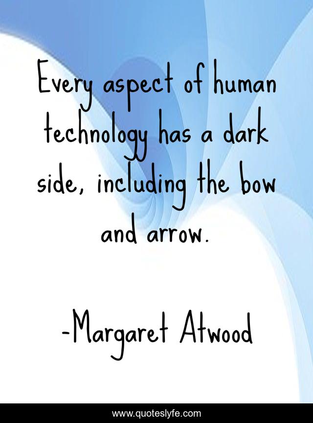This page presents the quote "Every aspect of human technology has a dark side, including the bow and arrow.". Author of this quote is Margaret Atwood. This quote is about dark, dark side, human,.