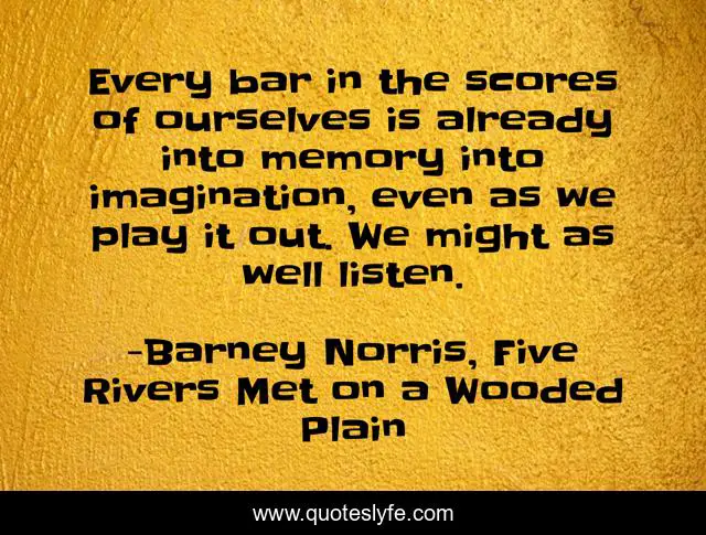 This page presents the quote "Every bar in the scores of ourselves is already into memory into imagination, even as we play it out. We might as well listen.". Author of this quote is Barney Norris, Five Rivers Met on a Wooded Plain. .