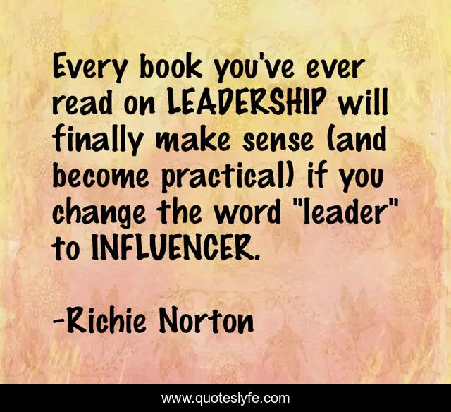 This page presents the quote "Every book you've ever read on LEADERSHIP will finally make sense (and become practical) if you change the word "leader" to INFLUENCER.". Author of this quote is Richie Norton. This quote is about confidence, self-mastery, mindful, marketing, work, success, self-help, entrepreneur, innovation,.