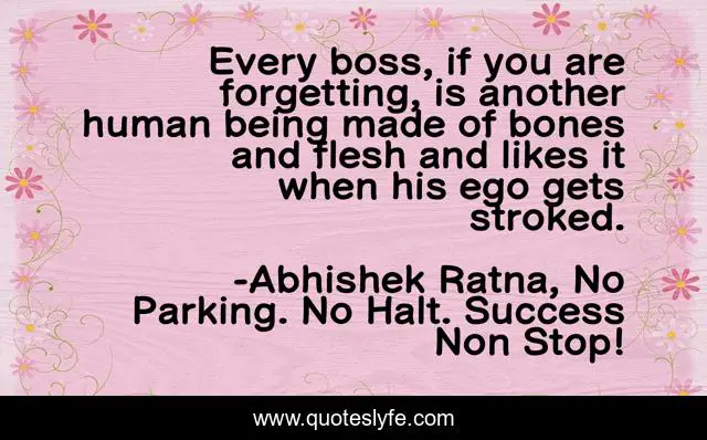 This page presents the quote "Every boss, if you are forgetting, is another human being made of bones and flesh and likes it when his ego gets stroked.". Author of this quote is Abhishek Ratna, No Parking. No Halt. Success Non Stop!. This quote is about manager, boss-ego, ego, success, boss,.