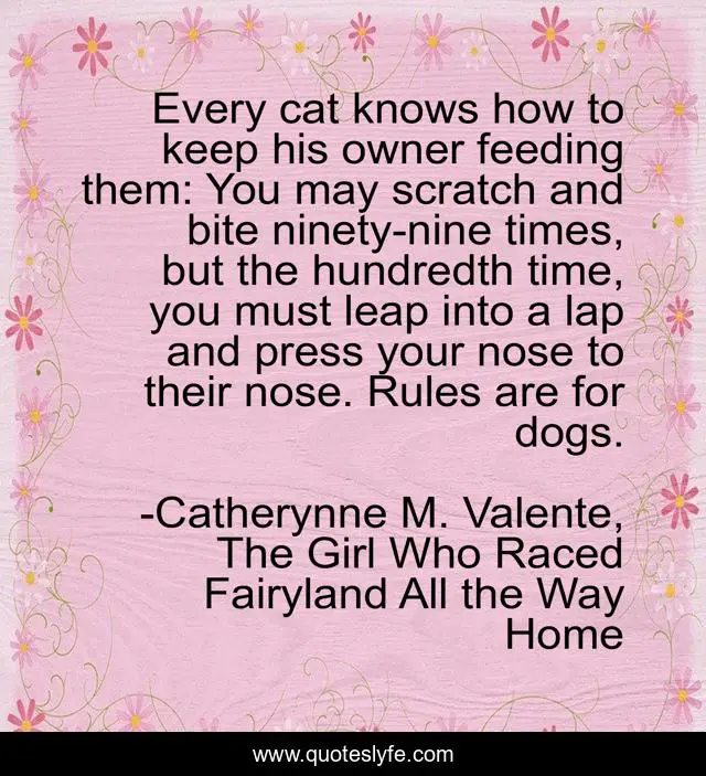 This page presents the quote "Every cat knows how to keep his owner feeding them: You may scratch and bite ninety-nine times, but the hundredth time, you must leap into a lap and press your nose to their nose. Rules are for dogs.". Author of this quote is Catherynne M. Valente, The Girl Who Raced Fairyland All the Way Home. This quote is about rules, cats, dogs,.
