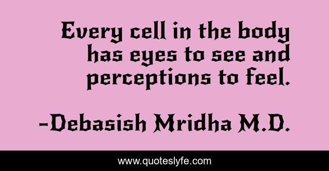 This page presents the quote "Every cell in the body has eyes to see and perceptions to feel.". Author of this quote is Debasish Mridha M.D.. This quote is about body, eyes-to-see, perceptions, debasish-mridha, every-cell-in-the-body, perceptions-to-feel, quotes, inspirational, enthusiasm,.