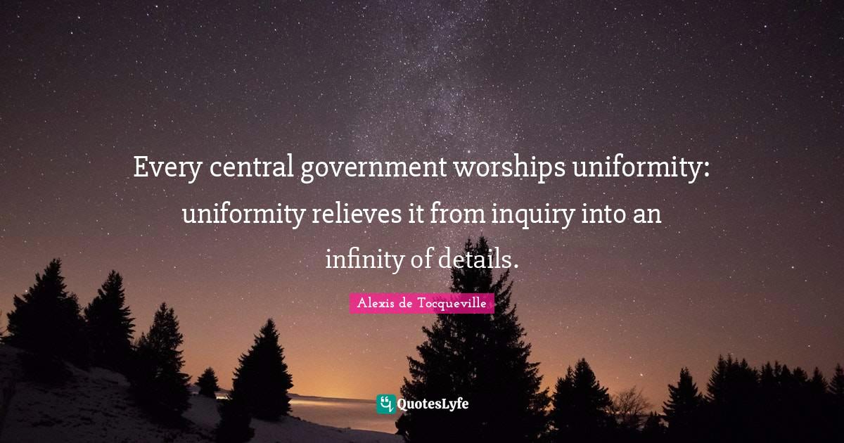 This page presents the quote "Every central government worships uniformity: uniformity relieves it from inquiry into an infinity of details.". Author of this quote is Alexis de Tocqueville. This quote is about government, infinity, inquiry, details, liberty, uniformity,.