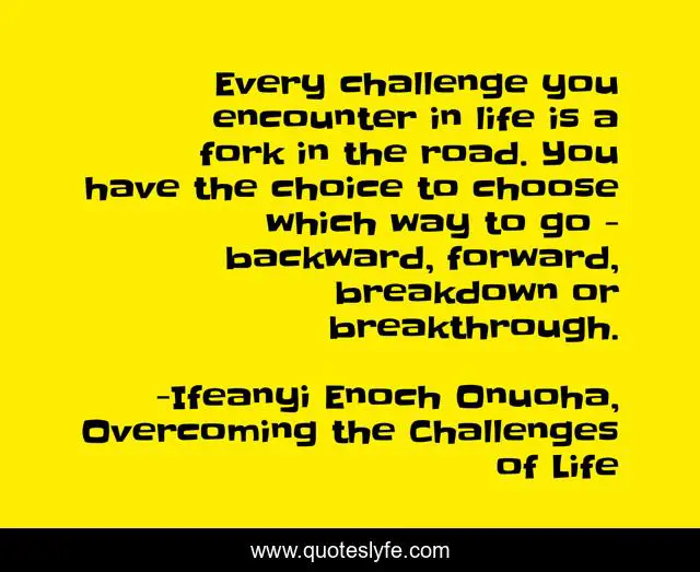 This page presents the quote "Every challenge you encounter in life is a fork in the road. You have the choice to choose which way to go - backward, forward, breakdown or breakthrough.". Author of this quote is Ifeanyi Enoch Onuoha, Overcoming the Challenges of Life. This quote is about living, life, positive, challenge, motivational, confidence, failing-forward, fortune-in-failing, optimistic,.