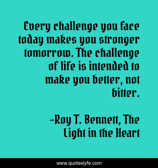 This page presents the quote "Every challenge you face today makes you stronger tomorrow. The challenge of life is intended to make you better, not bitter.". Author of this quote is Roy T. Bennett, The Light in the Heart. This quote is about motivation, inspire, optimistic, inspirational-life, life-and-living, living, inspiring, positive, positive-thinking,.