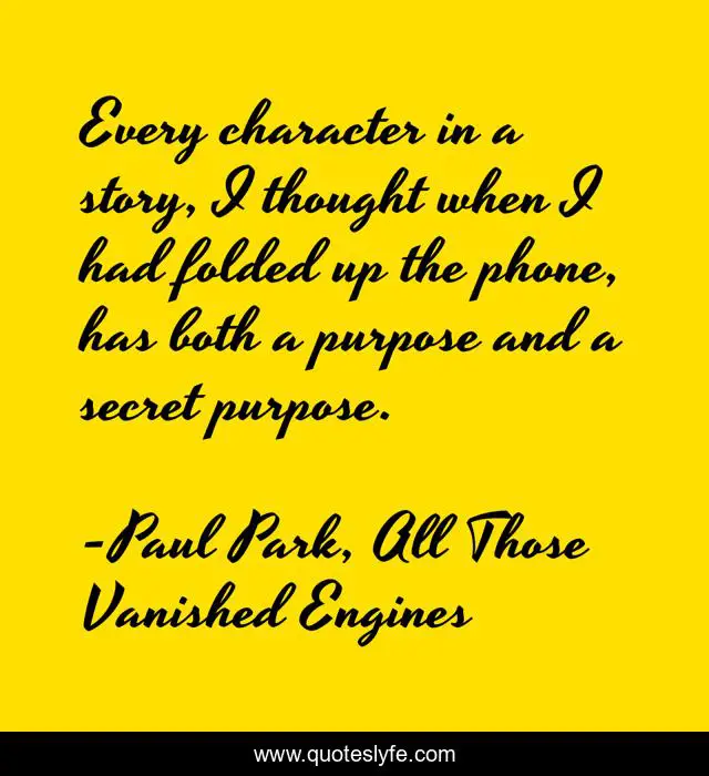This page presents the quote "Every character in a story, I thought when I had folded up the phone, has both a purpose and a secret purpose.". Author of this quote is Paul Park, All Those Vanished Engines. This quote is about story, character, purpose,.