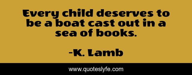 This page presents the quote "Every child deserves to be a boat cast out in a sea of books.". Author of this quote is K. Lamb. This quote is about educate, literature, read, kidlit, book, child, teach,.