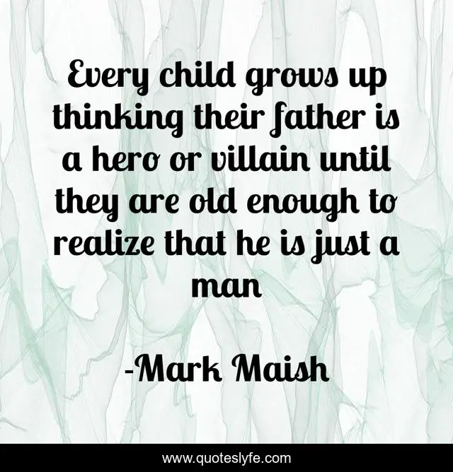 This page presents the quote "Every child grows up thinking their father is a hero or villain until they are old enough to realize that he is just a man". Author of this quote is Mark Maish. This quote is about fathers, father, fathers-and-sons, fatherhood, fathers-and-daughters, fathers-day,.