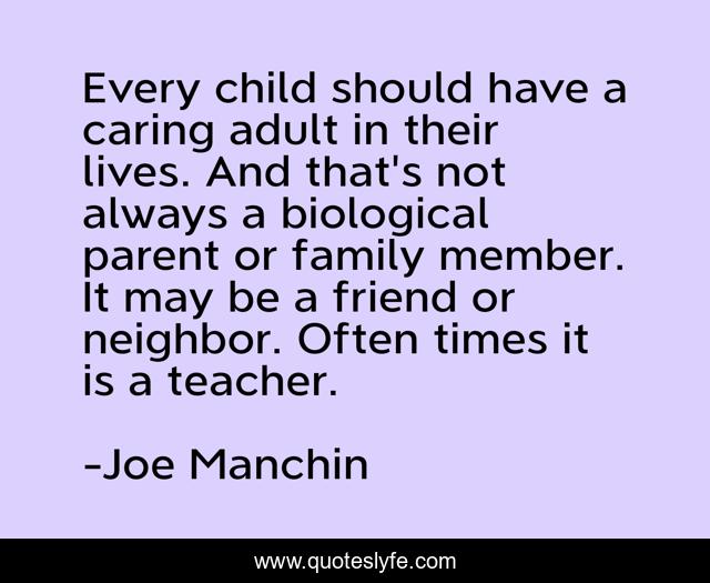 This page presents the quote "Every child should have a caring adult in their lives. And that's not always a biological parent or family member. It may be a friend or neighbor. Often times it is a teacher.". Author of this quote is Joe Manchin. This quote is about caring, family, child,.
