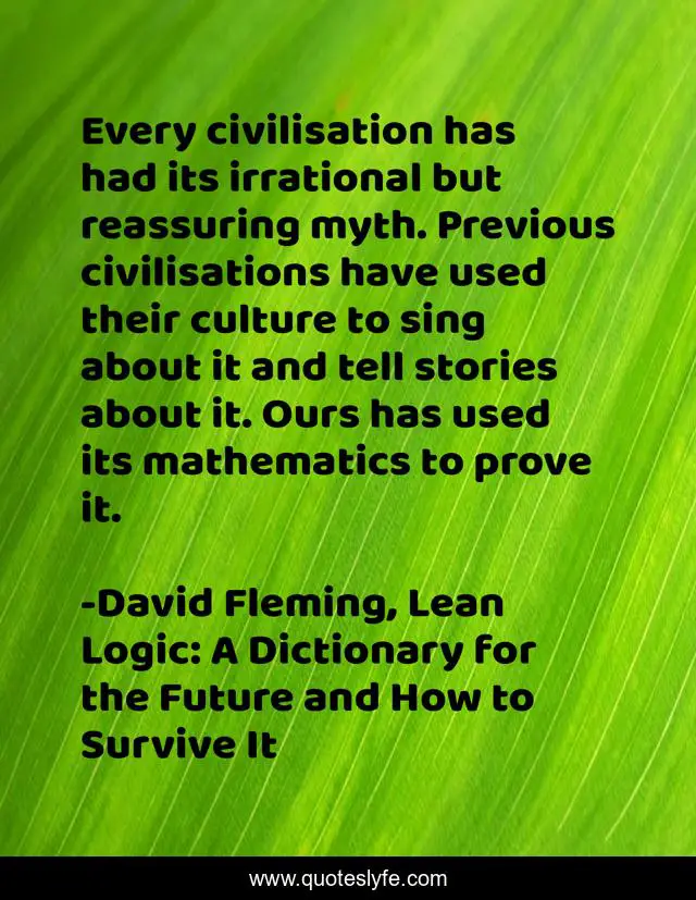 This page presents the quote "Every civilisation has had its irrational but reassuring myth. Previous civilisations have used their culture to sing about it and tell stories about it. Ours has used its mathematics to prove it.". Author of this quote is David Fleming, Lean Logic: A Dictionary for the Future and How to Survive It. This quote is about culture, civilization, economic-growth, myth,.