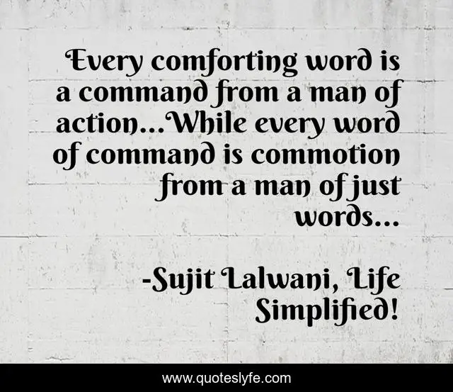 This page presents the quote "Every comforting word is a command from a man of action...While every word of command is commotion from a man of just words...". Author of this quote is Sujit Lalwani, Life Simplified!. This quote is about confidence, inspirational, positive, motivational, optimistic, life-lessons, enthusiasm, inspiration,.