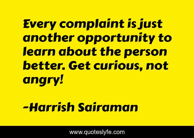 This page presents the quote "Every complaint is just another opportunity to learn about the person better. Get curious, not angry!". Author of this quote is Harrish Sairaman. This quote is about quote-of-the-day, quotes, curiosity, complaints, curious, opportunity,.