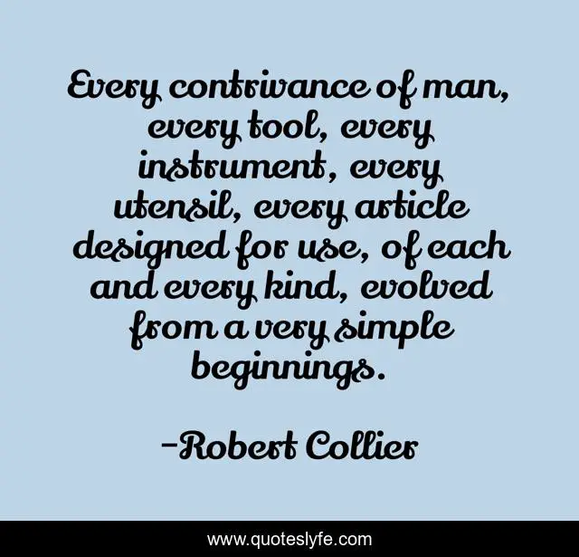 This page presents the quote "Every contrivance of man, every tool, every instrument, every utensil, every article designed for use, of each and every kind, evolved from a very simple beginnings.". Author of this quote is Robert Collier. This quote is about simple, kind, man,.