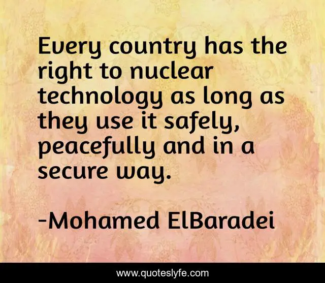 This page presents the quote "Every country has the right to nuclear technology as long as they use it safely, peacefully and in a secure way.". Author of this quote is Mohamed ElBaradei. This quote is about country, long, way,.