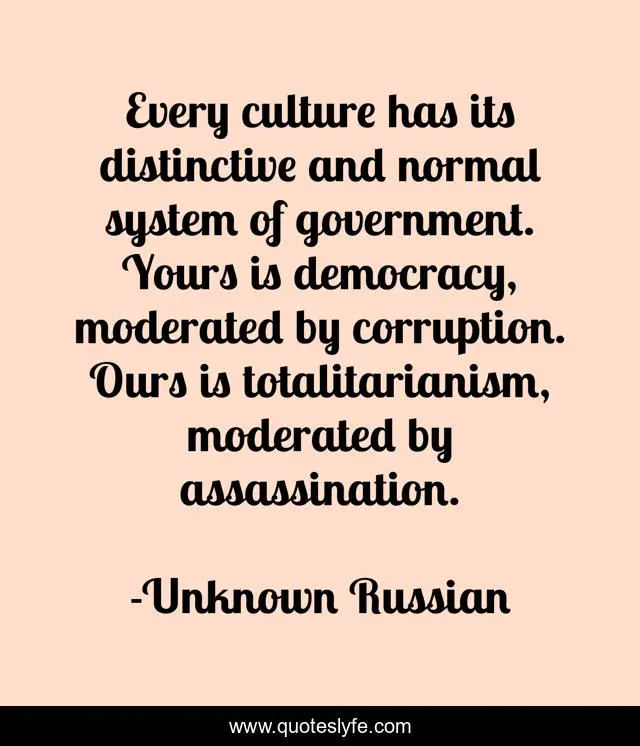 This page presents the quote "Every culture has its distinctive and normal system of government. Yours is democracy, moderated by corruption. Ours is totalitarianism, moderated by assassination.". Author of this quote is Unknown Russian. This quote is about totalitarianism, assassination, democracy, government,.