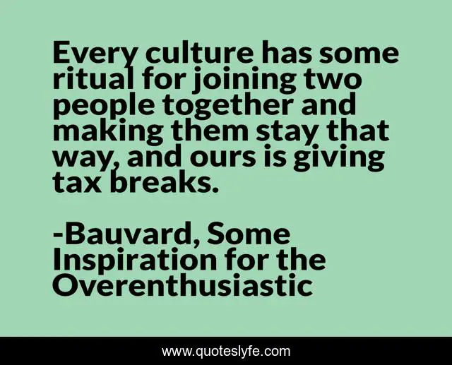 This page presents the quote "Every culture has some ritual for joining two people together and making them stay that way, and ours is giving tax breaks.". Author of this quote is Bauvard, Some Inspiration for the Overenthusiastic. This quote is about funny, comedy, marriage, humor, taxes,.