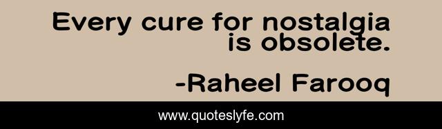 "Raheel Farooq Quotes." Quoteslyfe.com, 2025. Mon. 08 Dec. 2025. <https://www.quoteslyfe.com/quote/Every-cure-for-nostalgia-is-obsolete-230627>.