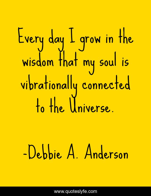 This page presents the quote "Every day I grow in the wisdom that my soul is vibrationally connected to the Universe.". Author of this quote is Debbie A. Anderson. This quote is about vibrational-energy, wisdom-inspirational, universe-knowing-oneself, connectedness, wisdom,.