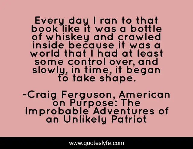 This page presents the quote "Every day I ran to that book like it was a bottle of whiskey and crawled inside because it was a world that I had at least some control over, and slowly, in time, it began to take shape.". Author of this quote is Craig Ferguson, American on Purpose: The Improbable Adventures of an Unlikely Patriot. This quote is about control, addiction, writing,.