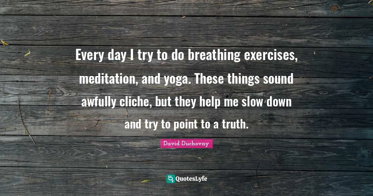 This page presents the quote "Every day I try to do breathing exercises, meditation, and yoga. These things sound awfully cliche, but they help me slow down and try to point to a truth.". Author of this quote is David Duchovny. This quote is about help me, sound, exercise, meditation, slow down, yoga, truth, cliche, breathing,.