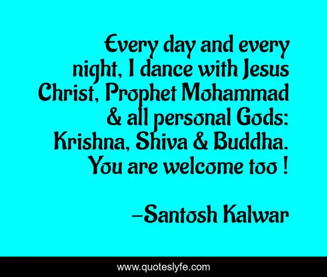 This page presents the quote "Every day and every night, I dance with Jesus Christ, Prophet Mohammad & all personal Gods: Krishna, Shiva & Buddha. You are welcome too !". Author of this quote is Santosh Kalwar. .