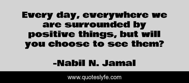 This page presents the quote "Every day, everywhere we are surrounded by positive things, but will you choose to see them?". Author of this quote is Nabil N. Jamal. This quote is about positve, nabil-n-jamal, nabil, surrounded, choice, see, everywhere, choose, nabil-jamal,.