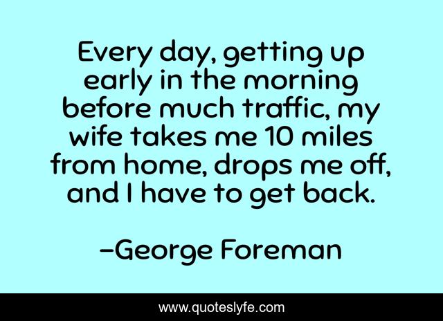 This page presents the quote "Every day, getting up early in the morning before much traffic, my wife takes me 10 miles from home, drops me off, and I have to get back.". Author of this quote is George Foreman. This quote is about home, day, wife,.