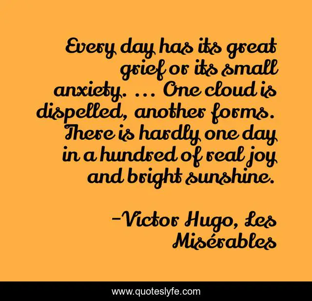 This page presents the quote "Every day has its great grief or its small anxiety. ... One cloud is dispelled, another forms. There is hardly one day in a hundred of real joy and bright sunshine.". Author of this quote is Victor Hugo, Les Misérables. This quote is about depression, happiness,.