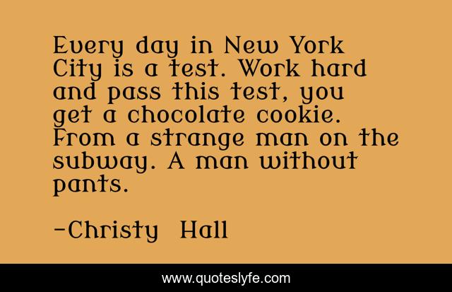 This page presents the quote "Every day in New York City is a test. Work hard and pass this test, you get a chocolate cookie. From a strange man on the subway. A man without pants.". Author of this quote is Christy Hall. This quote is about humorous, writers, new-york,.