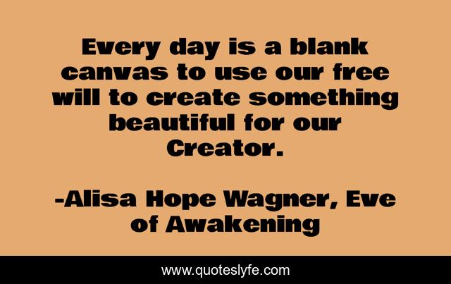 This page presents the quote "Every day is a blank canvas to use our free will to create something beautiful for our Creator.". Author of this quote is Alisa Hope Wagner, Eve of Awakening. This quote is about faith, free-will, christianity, slate, god,.