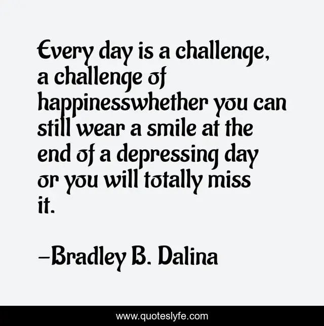 This page presents the quote "Every day is a challenge, a challenge of happinesswhether you can still wear a smile at the end of a depressing day or you will totally miss it.". Author of this quote is Bradley B. Dalina. This quote is about smile, challenge, happiness,.
