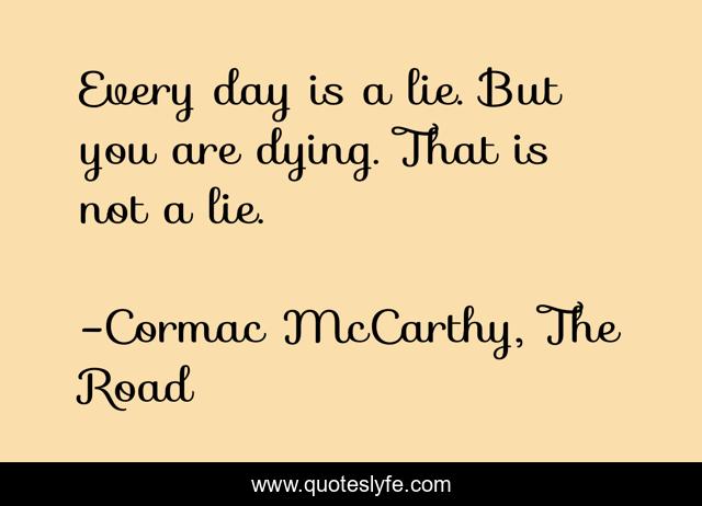 This page presents the quote "Every day is a lie. But you are dying. That is not a lie.". Author of this quote is Cormac McCarthy, The Road. This quote is about life, death,.