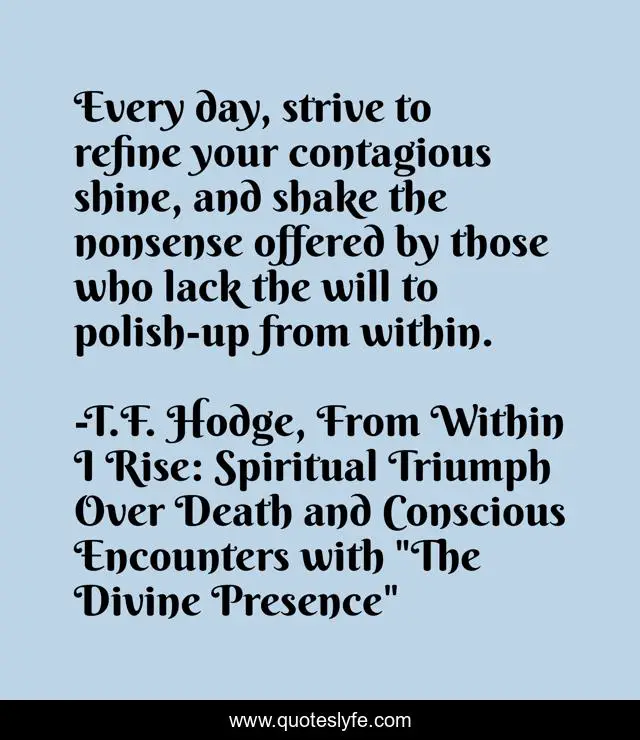 This page presents the quote "Every day, strive to refine your contagious shine, and shake the nonsense offered by those who lack the will to polish-up from within.". Author of this quote is T.F. Hodge, From Within I Rise: Spiritual Triumph Over Death and Conscious Encounters with "The Divine Presence". This quote is about shine, strength, will-power, strength-of-character, nonsense, shine-bright, refinement, refine, refined,.