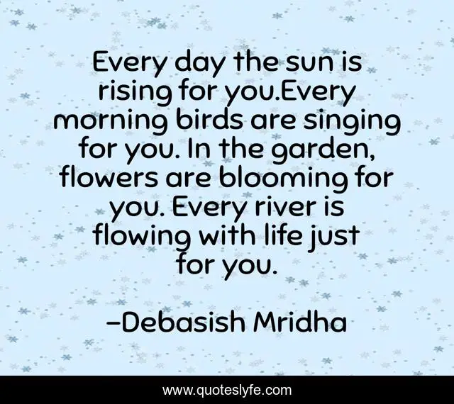This page presents the quote "Every day the sun is rising for you.Every morning birds are singing for you. In the garden, flowers are blooming for you. Every river is flowing with life just for you.". Author of this quote is Debasish Mridha. This quote is about philosophy, nature, mridha, debasish, life-is-waiting-for-you, inspirational, enthusiasm,.
