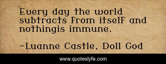 This page presents the quote "Every day the world subtracts from itself and nothingis immune.". Author of this quote is Luanne Castle, Doll God. This quote is about enthusiasm, spiritual, philosophical, inspirational, poetry,.