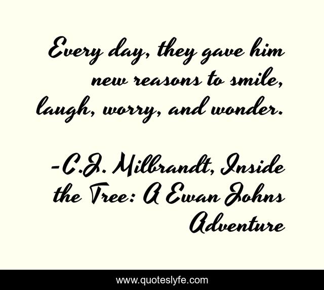 This page presents the quote "Every day, they gave him new reasons to smile, laugh, worry, and wonder.". Author of this quote is C.J. Milbrandt, Inside the Tree: A Ewan Johns Adventure. This quote is about kids-books, family, joy, kid-s-literature, happy, wonder,.