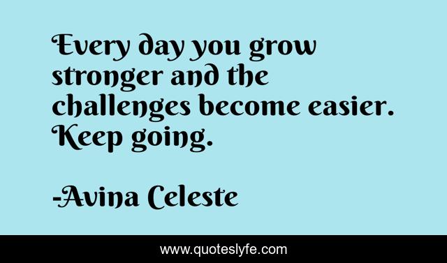 This page presents the quote "Every day you grow stronger and the challenges become easier. Keep going.". Author of this quote is Avina Celeste. This quote is about confidence, strength, positive, motivational, challenges, optimistic, inspirational, enthusiasm,.