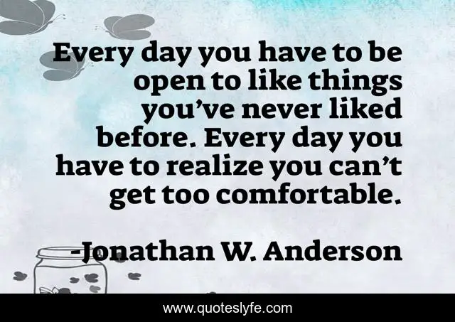 This page presents the quote "Every day you have to be open to like things you’ve never liked before. Every day you have to realize you can’t get too comfortable.". Author of this quote is Jonathan W. Anderson. .