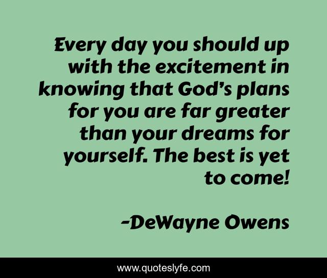 This page presents the quote "Every day you should up with the excitement in knowing that God’s plans for you are far greater than your dreams for yourself. The best is yet to come!". Author of this quote is DeWayne Owens. This quote is about life, inspirational, success, leadership-development, leadership-charteristics, motivational-inspirational, motivational, confidence, wisdom,.