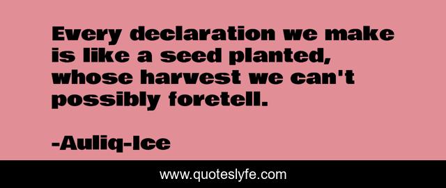 This page presents the quote "Every declaration we make is like a seed planted, whose harvest we can't possibly foretell.". Author of this quote is Auliq-Ice. This quote is about uncertainties, life, learning-from-mistakes, mistakes-in-life, doubt, change-and-impermanence, uncertainty, uncertainties-in-life, trial-and-error,.