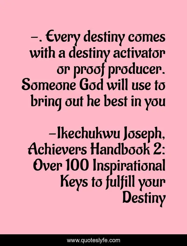 This page presents the quote "-. Every destiny comes with a destiny activator or proof producer. Someone God will use to bring out he best in you". Author of this quote is Ikechukwu Joseph, Achievers Handbook 2: Over 100 Inspirational Keys to fulfill your Destiny. This quote is about achievers, christian-living, self-improvement,.