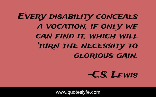 This page presents the quote "Every disability conceals a vocation, if only we can find it, which will 'turn the necessity to glorious gain.". Author of this quote is C.S. Lewis. This quote is about providence, adversity, trials,.