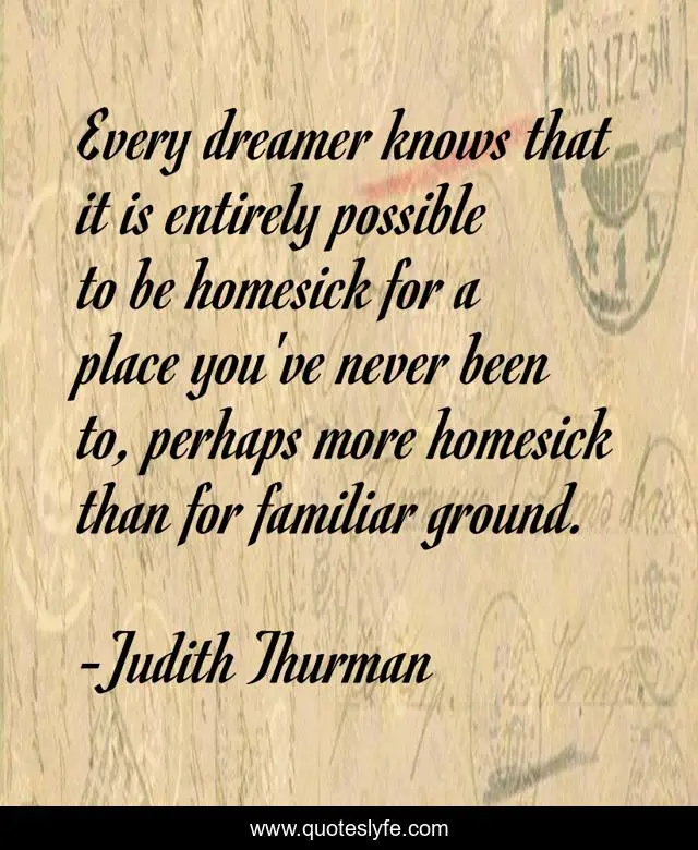 This page presents the quote "Every dreamer knows that it is entirely possible to be homesick for a place you've never been to, perhaps more homesick than for familiar ground.". Author of this quote is Judith Thurman. This quote is about explore, travel, dreamer,.