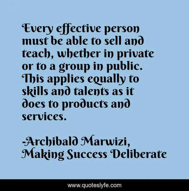 This page presents the quote "Every effective person must be able to sell and teach, whether in private or to a group in public. This applies equally to skills and talents as it does to products and services.". Author of this quote is Archibald Marwizi, Making Success Deliberate. This quote is about life, success, behaviour, attitude, legacy, growth, purpose, inspirational, leadership,.