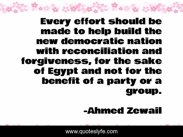 This page presents the quote "Every effort should be made to help build the new democratic nation with reconciliation and forgiveness, for the sake of Egypt and not for the benefit of a party or a group.". Author of this quote is Ahmed Zewail. This quote is about party, effort, help,.